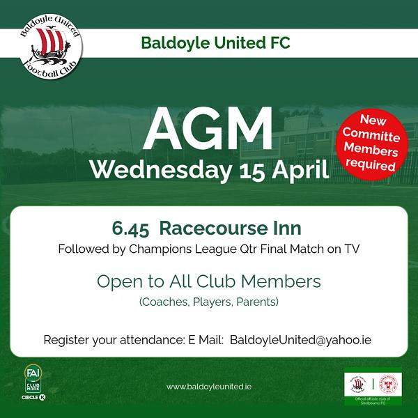 The Baldoyle United club AGM is on Weds 15 April in The Racecourse Inn function room.