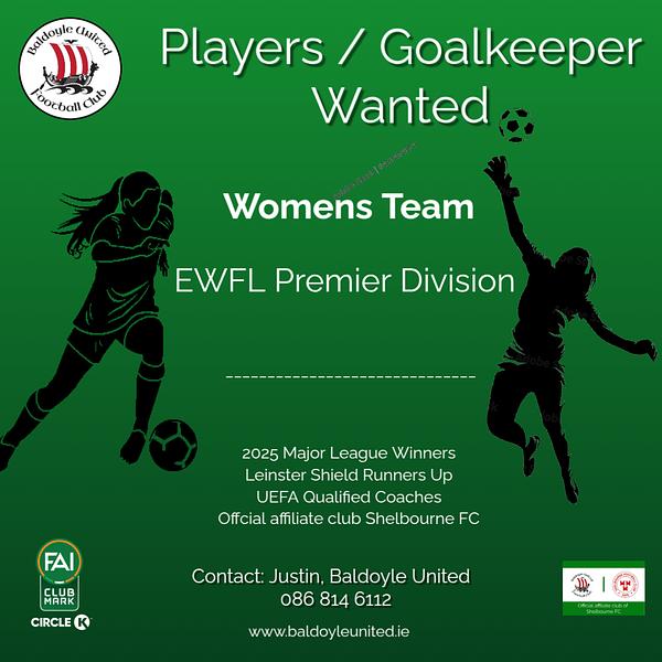 Baldoyle United looking for experienced outfield players and a Goalkeeper for its recently promoted Eastern Women's Football League Premier Division side.